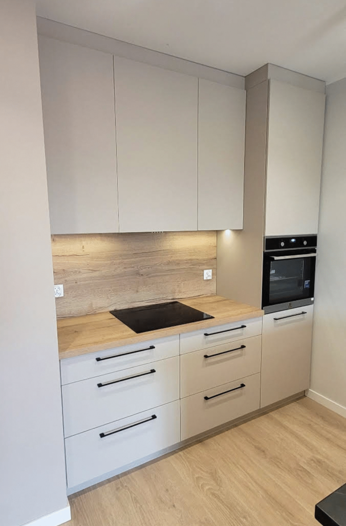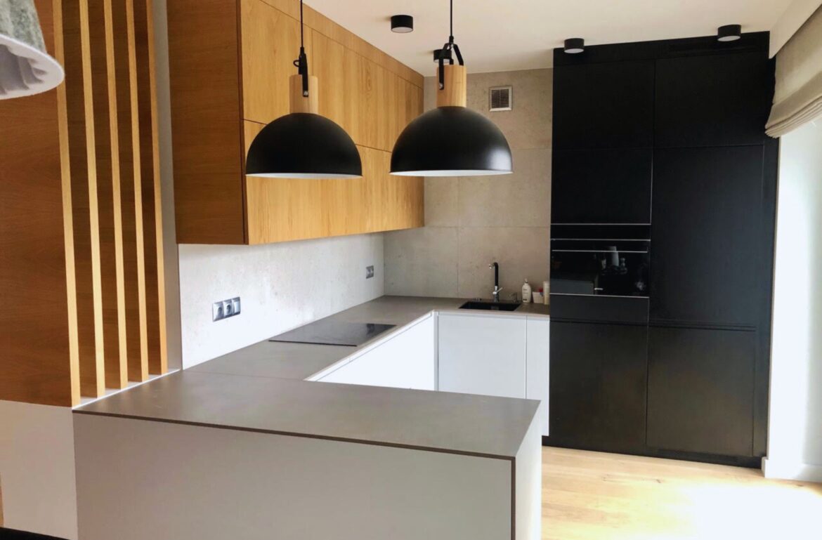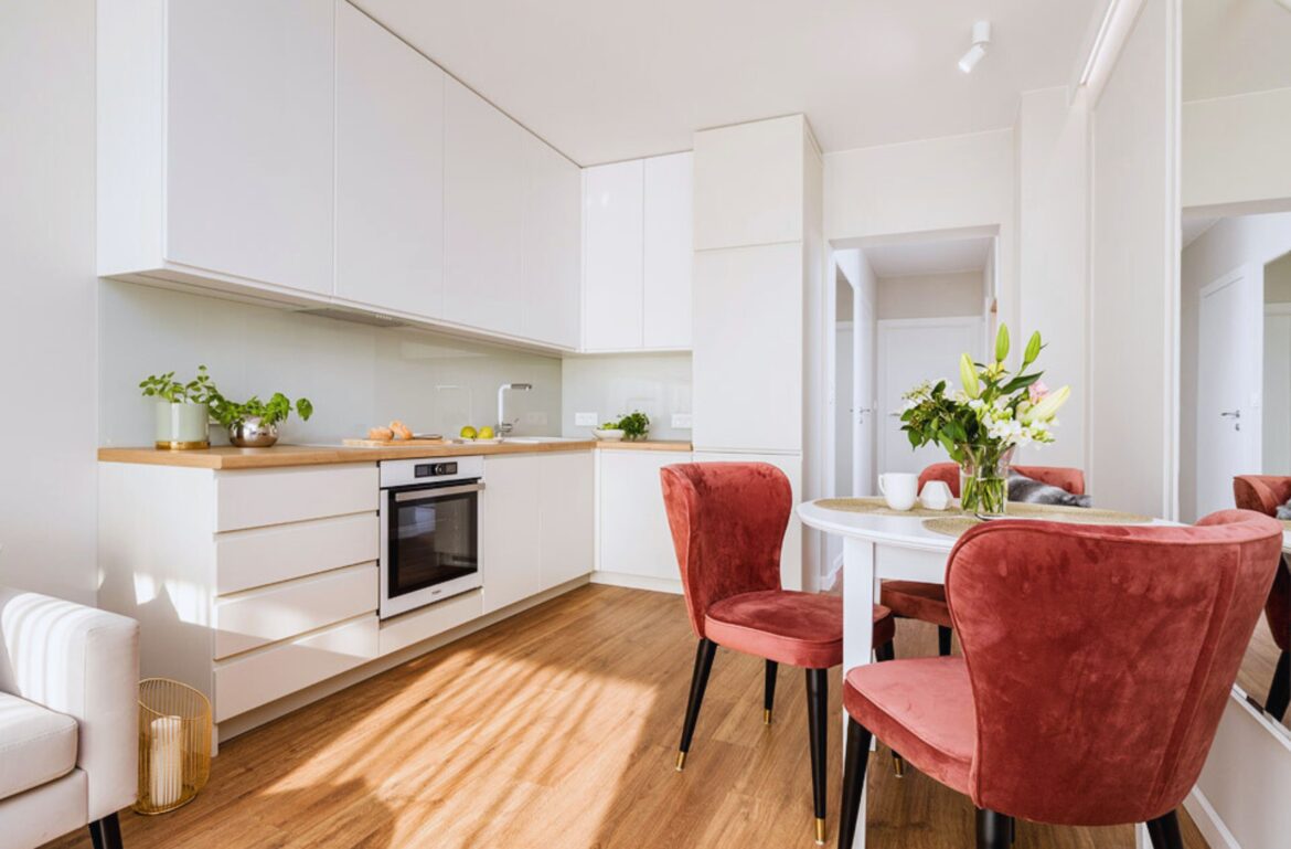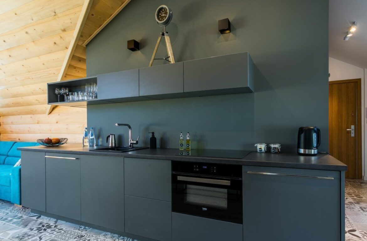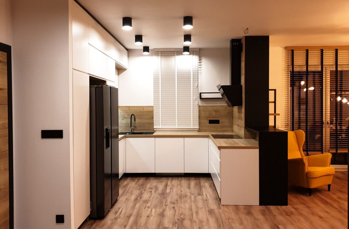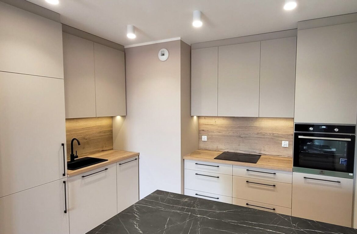 - Dobrze dopasowana zabudowa kuchenna do wymiarów pomieszczenia.