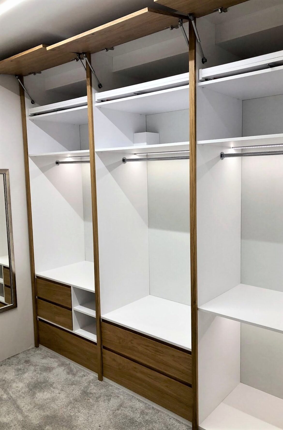 Marzenie wielu osób – garderoba na wymiar. Tu nie ma miejsca na przypadkowość, wszystko musi być dobrze zaprojektowane. Zawsze kładziemy duży nacisk na Państwa potrzeby, pytamy o wiele spraw, aby jak najlepiej zaprojektować wymarzoną garderobę. Często nie służy ona tylko do przechowywania ubrań, ale jest to miejsce, gdzie chcemy wyeksponować piękne przedmioty jak torebki, buty i galanterię. Przechowujemy w niej biżuterię, potrzebujemy miejsce na toaletkę, czy piękne siedzisko. Projektujemy garderoby kompleksowo, zajmujemy się każdym elementem. Dobierzemy kolory, tapety, podłogi, zaprojektujemy i wykonamy pełne zabudowy i drobne, stylowe meble, oraz dobierzemy dodatki. Wyposażymy Państwa garderobę w niezbędne akcesoria, zastosujemy wysokiej jakości prowadnice do szuflad, eleganckie wkłady i dobierzemy oświetlenie.